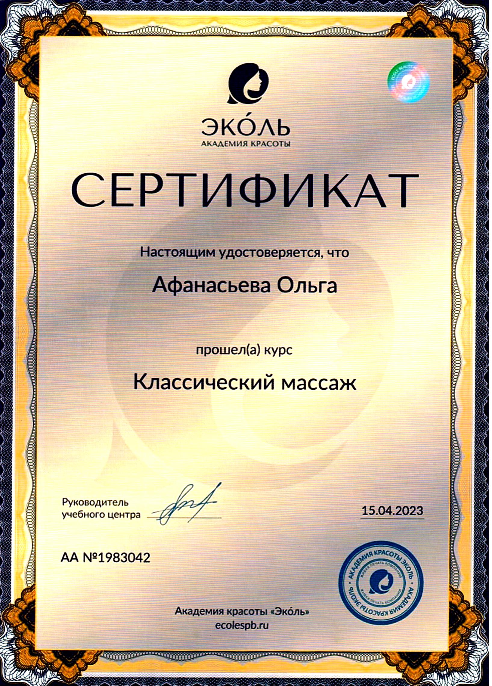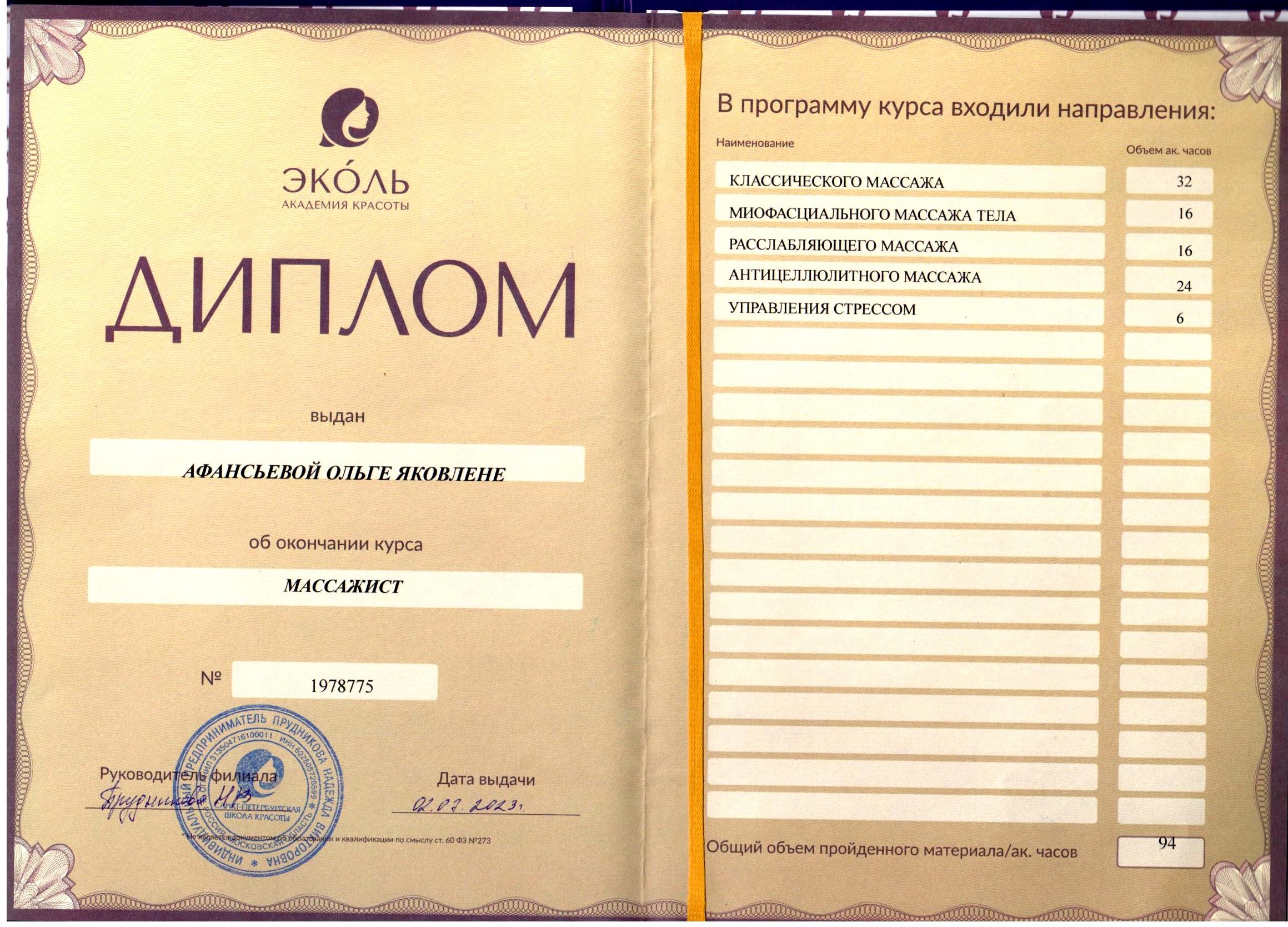 - Специалист, участвующий в акции, прошёл обучение, получил диплом массажиста и сертификаты о прохождении курсов: